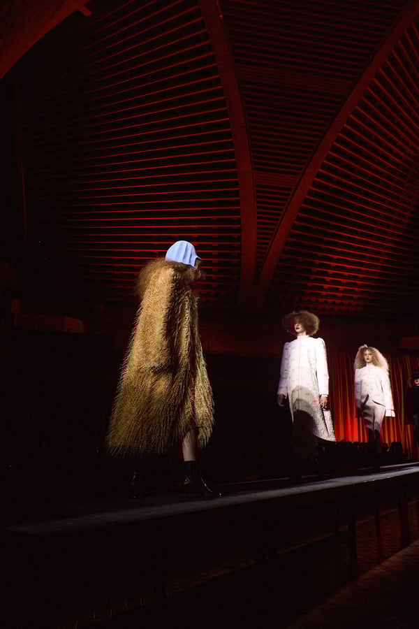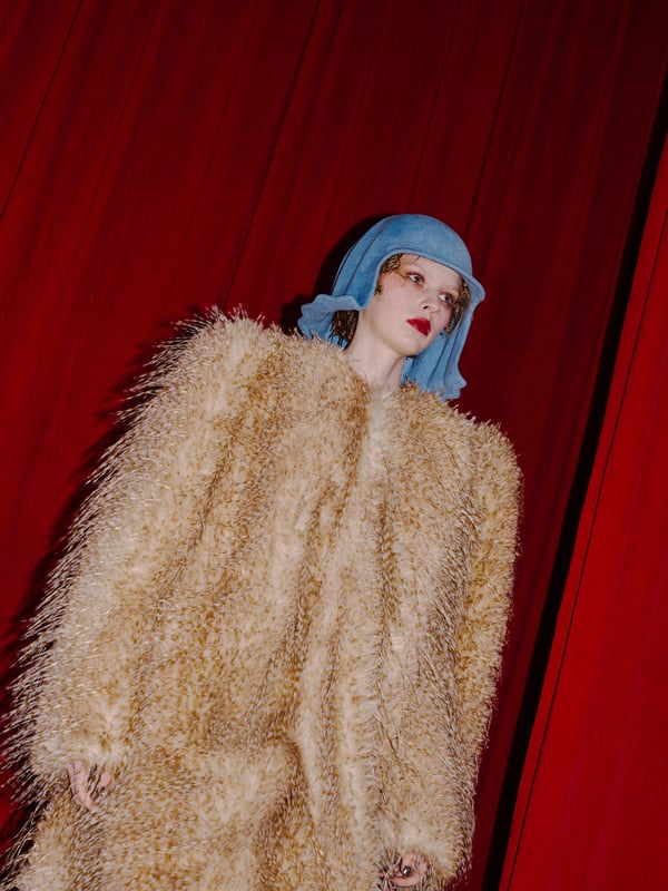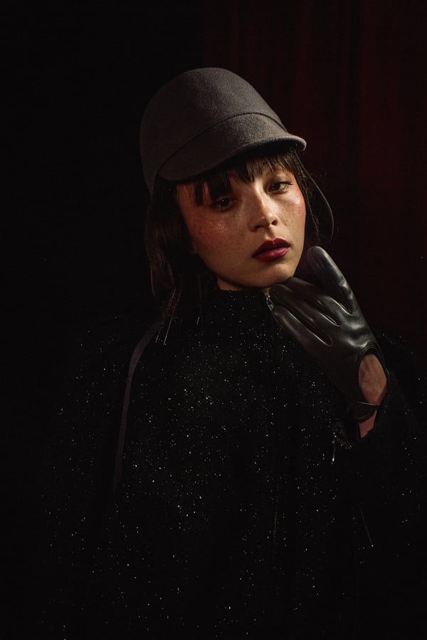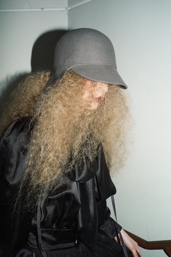 コレクションに遊び心を加えた帽子は、「キジマ タカユキ(KIJIMA TAKAYUKI)」とのコラボレーションで製作。フライトキャップを模したスポーティーデザインと、ボブヘアのカツラをイメージしたデザインの2型が登場し、“混沌とカオス”というブランドの世界観を視覚的に補強した。